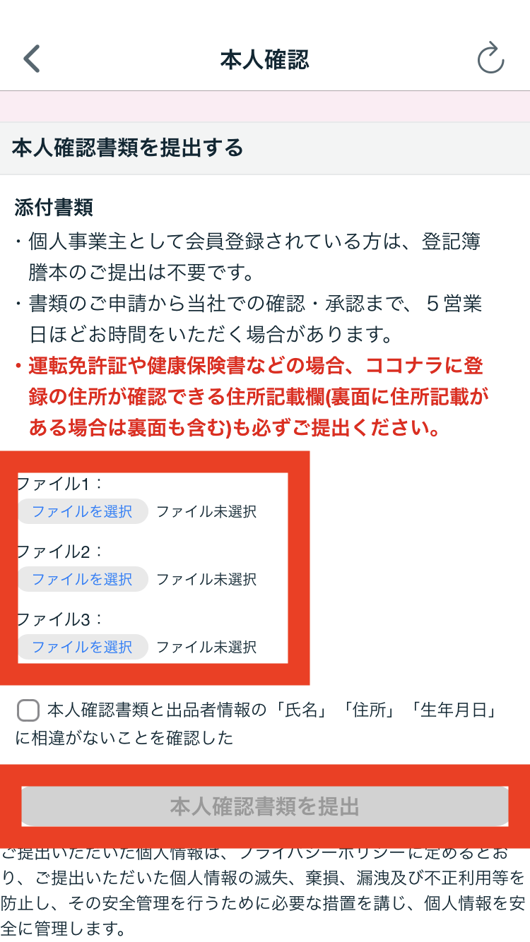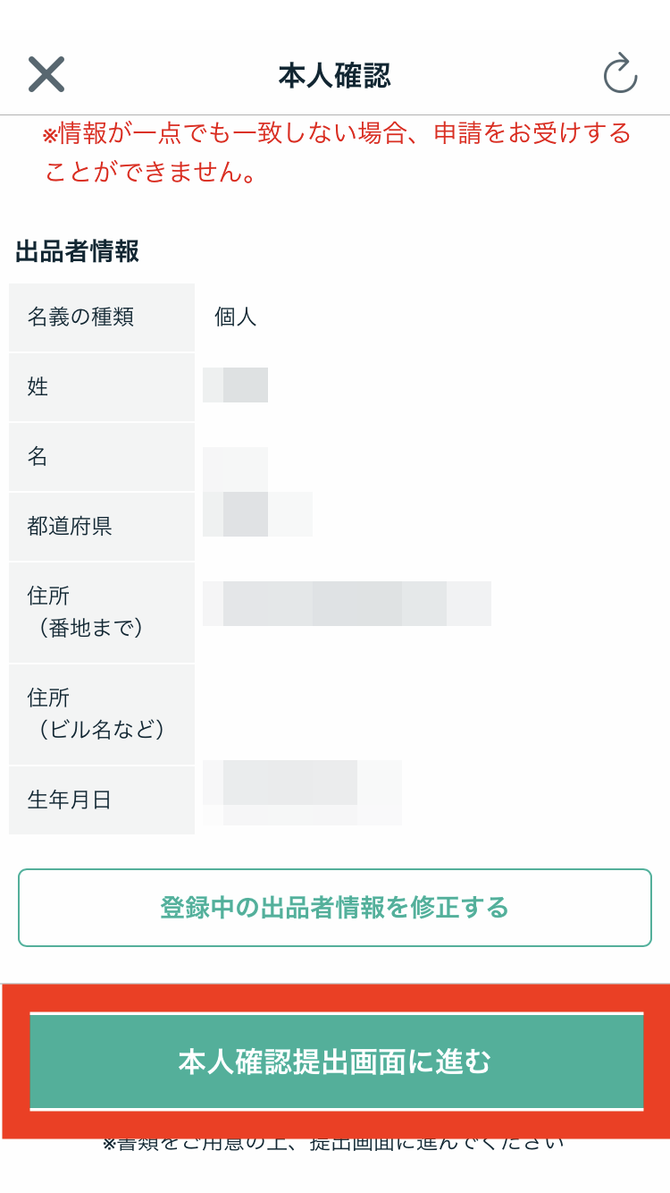 ③出品者情報が本人確認書類と相違がないか確認し本人確認提出画面に進む