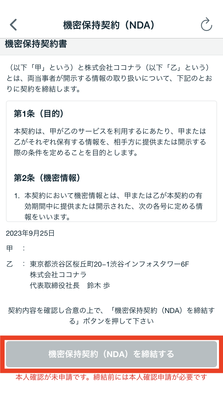 ③契約内容を確認し「機密保持契約を締結する」をタップ